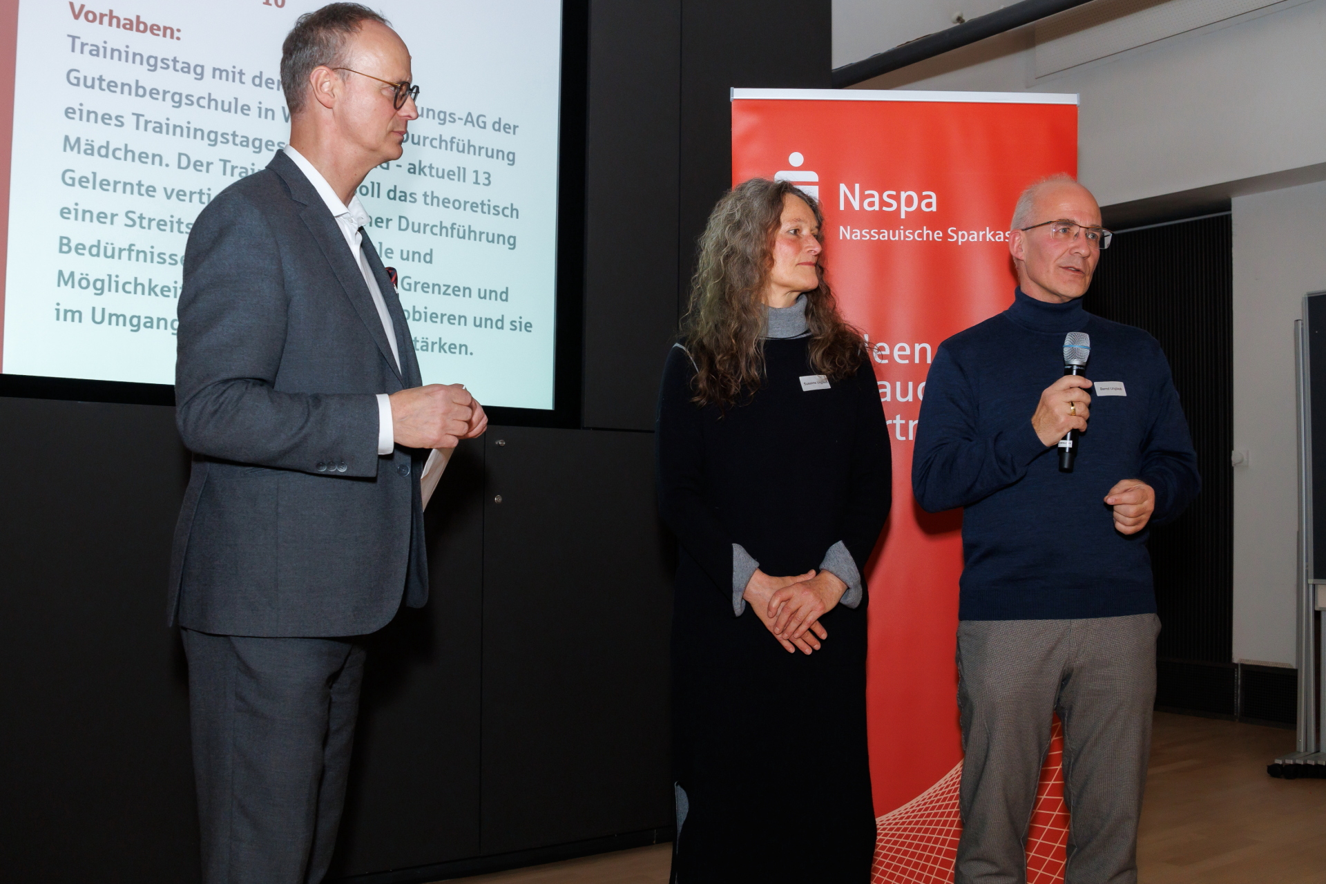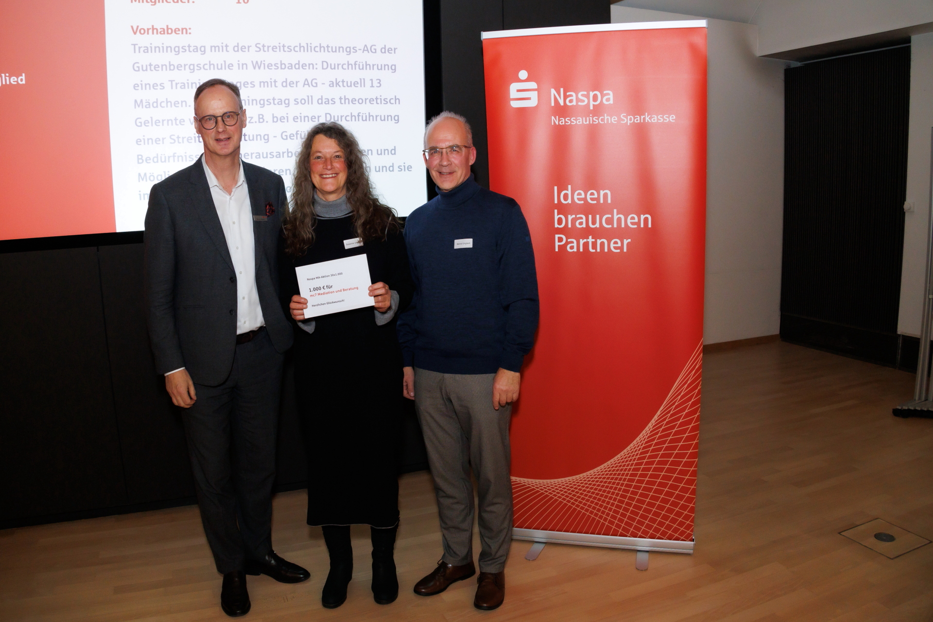 Ein Empfänger von 1.000 Euro ist die mc7 Mediation und Beratung. Naspa-Mitarbeiterin Anja Siehoff wurde ausgezeichnet und Vereinsvertreter Bernd Unglaub mit Susanne Unglaub haben das Geld entgegengenommen. Damit soll ein Trainingstag mit der Streitschlitungs-AG der Gutenberschule in Wiesbaden mit 13 Mädchen durchgeführt werden.